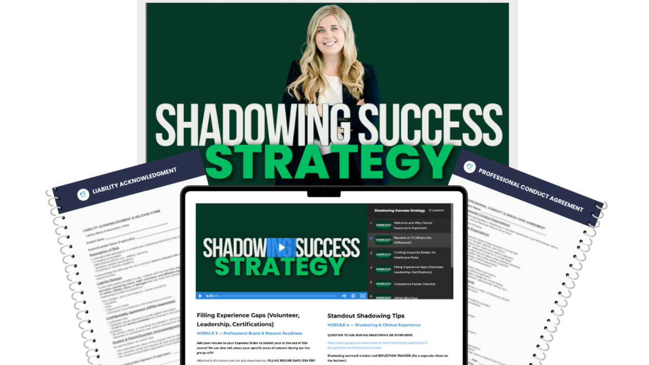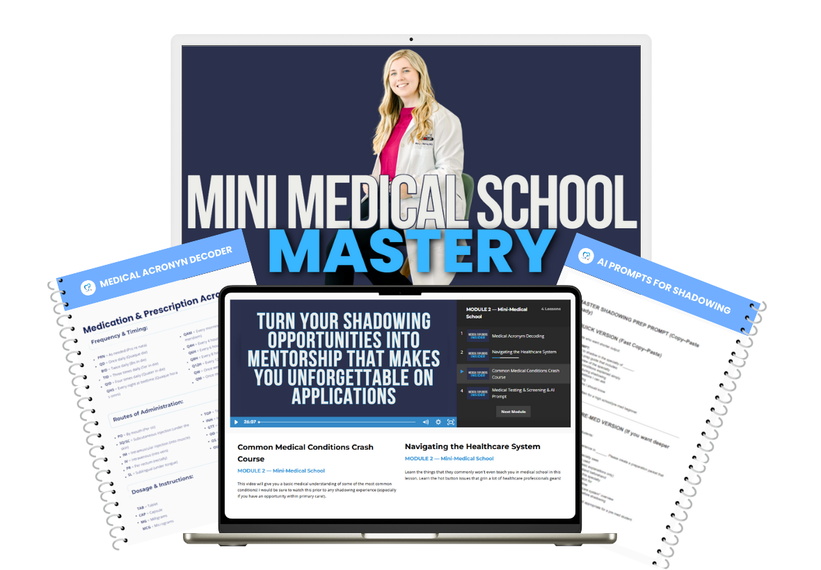 The Shadowing Success Strategy (9 Bite-Sized Lessons): The exact system I used to go from zero healthcare connections to physician mentors who wrote my medical school recommendation letters — broken down so you can replicate the same results in your area. ($147 value)